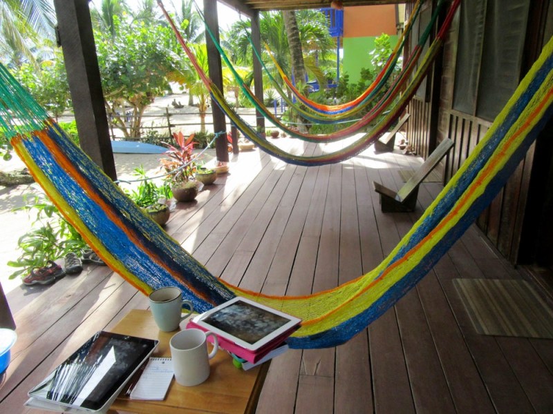 Un petit déjeuner sur la véranda à Tipple Tree Beya, à lire notre journal numérique…avec vue sur la mer…incomparable. Hopkins, Stann Creek District, Belize.