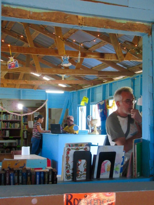 Nous avons obtenu la permission de visiter la bibliothèque et de prendre des photos. Elle est très attirante avec ses murs bleus, un bel environnement pour la lecture. Hopkins, Stann Creek District, Belize.