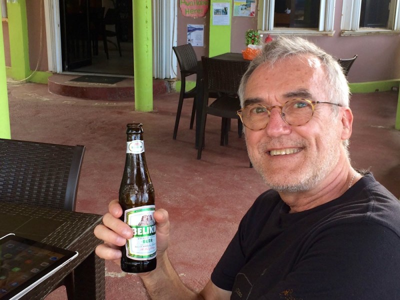 Dans l’attente d’un repas bien apprécié sur la terrasse du restaurant Innies. L’effigie sur l’étiquette de la bière Belikin est inspirée du Temple of the Masonry Altars, une structure de Altun Ha. Hopkins, Stann Creek District, Belize