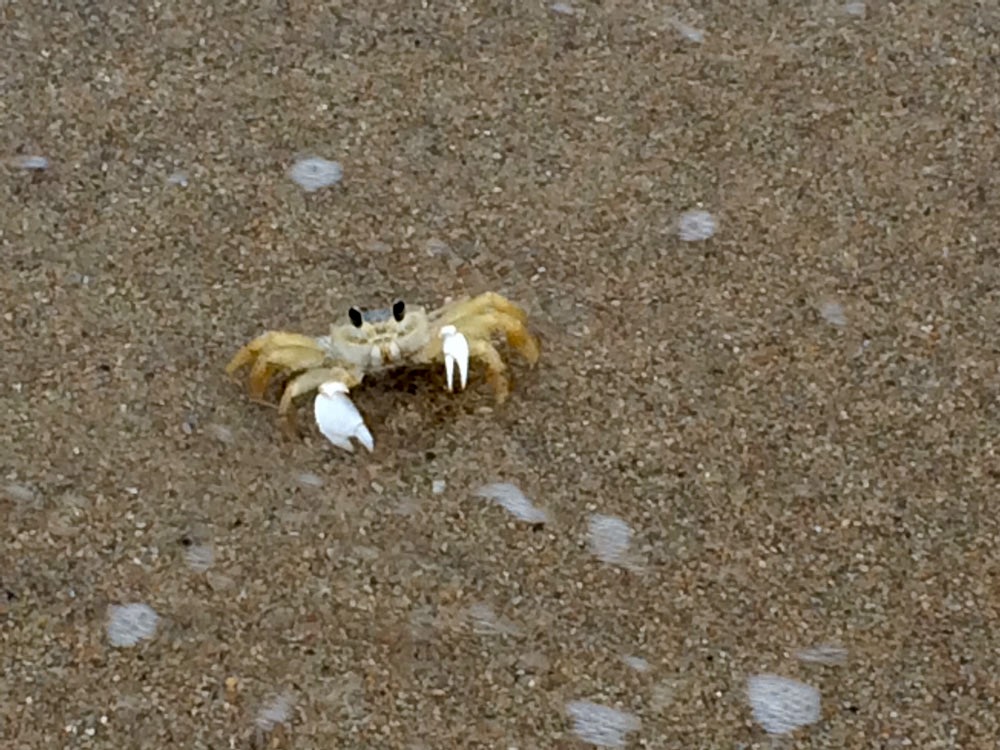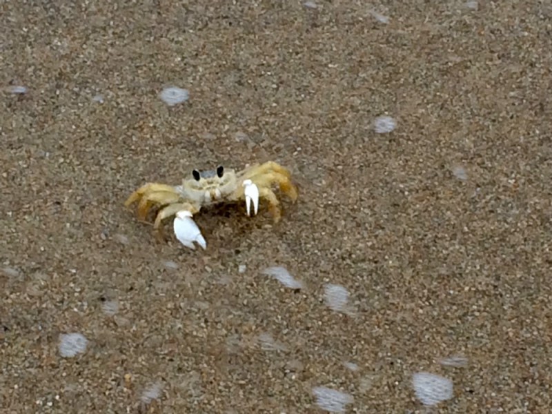 La longue plage de Hopkins invite à la marche. Lors de notre passage, elle était peu fréquentée. Un jour, un petit crabe s’est arrêté devant nous et nous a longuement observés. Hopkins, Stann Creek District, Belize.