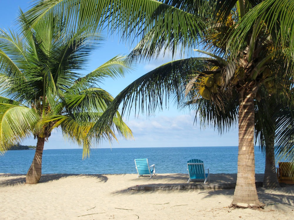 Sur la plage de Placencia, un iguane se fait dorer au soleil, bien étendu sur une branche de l’un de ces deux palmiers. Le voyez-vous? Il est quand même assez gros…Stann Creek District, Belize.