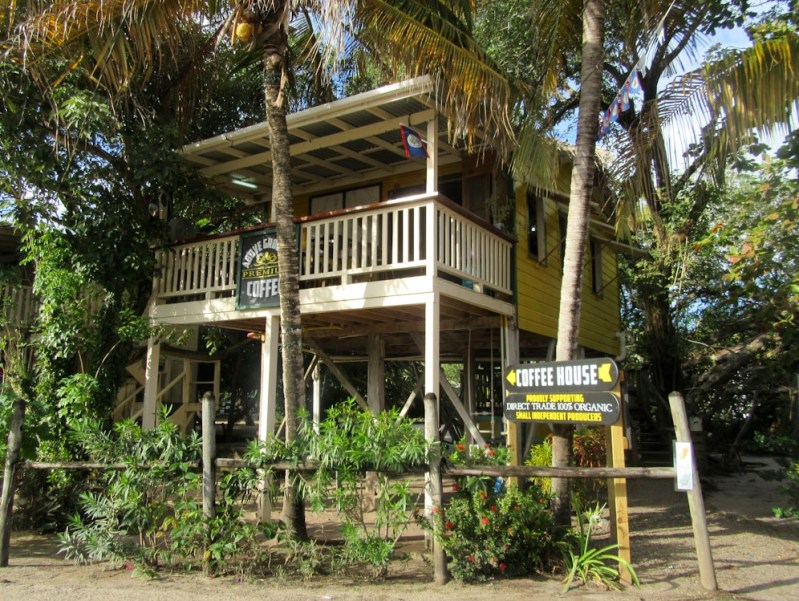 Déguster un café frais moulu, assis sur le balcon à travers les arbres: une petite pause bien appréciée. Placencia, Stann Creek District, Belize.