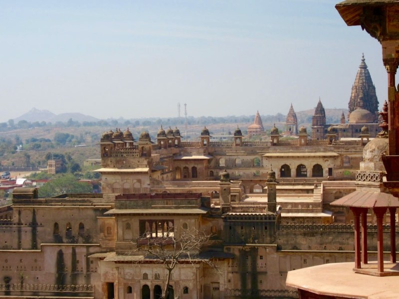 Vue sur le Raja Mahal, le palais voisin du Jahangir Mahal. En arrière plan, à droite, nous apercevons au loin les dômes du temple Chaturbhuj, Orchha, Inde.