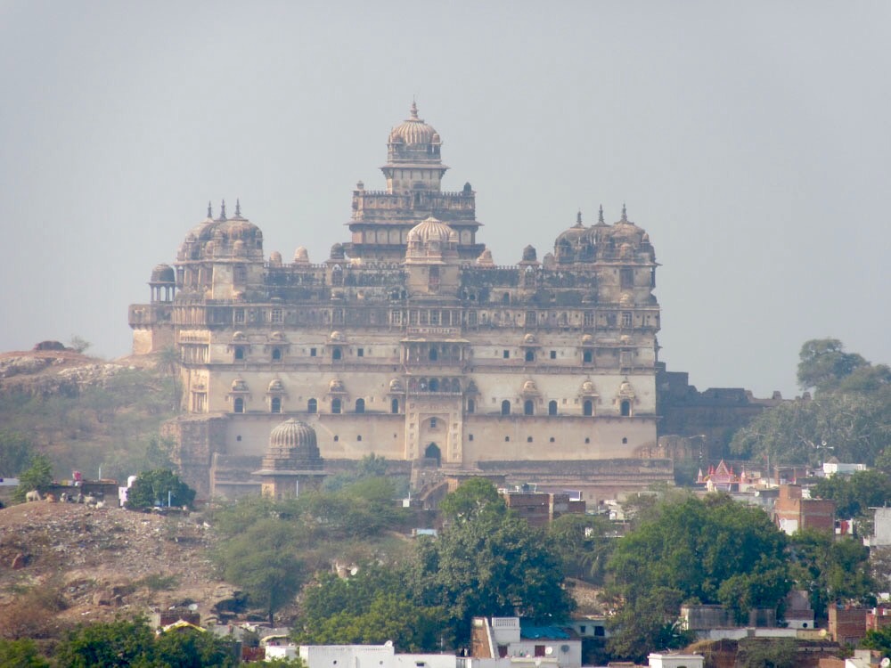 Le Birsingh Deo Palace ou le Old Palace règne toujours sur la ville de Datia, perdu dans le brouillard humide de l’après-midi, Inde.