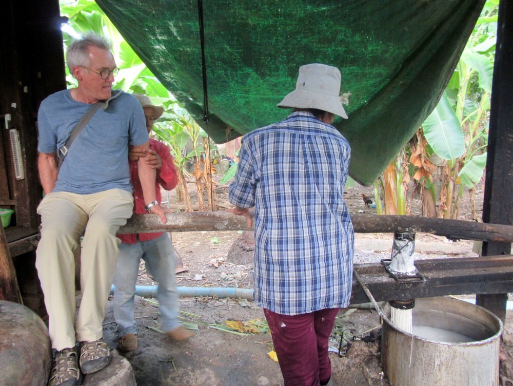 Mon amoureux s’est offert pour aider à presser la pâte de riz qui tombe dans la marmite remplie d’eau. Même avec l’effet de levier il n’est pas assez lourd! Sokcheat doit ajouter du poids. Chhlong, Cambodge.