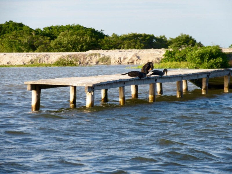 Des oiseaux se prélassent sur un quai de bois près de la saline, Rio Lagartos, Yucatán, Mexique.