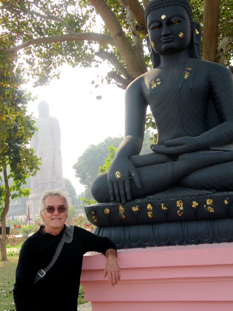 Visite au temple Thaï à Sarnath. Loin derrière Robert nous apercevons un Bouddha de plus de 80 pieds, Inde.