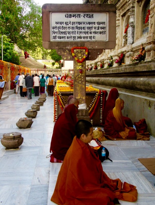 Moines pendant leur méditation au temple Mahabodhi, Bodh Gaya, Inde.