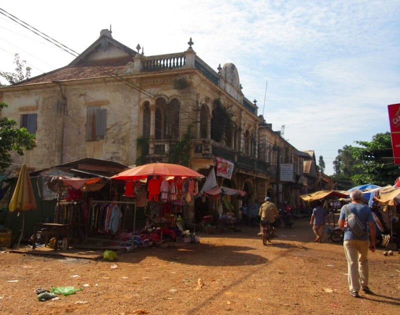 Des commerces ont maintenant pris place dans les grandes demeures coloniales et forment un grand marché. Chhlong, Cambodge.