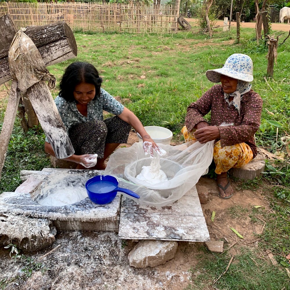 Ces femmes préparent des nouilles de riz selon une méthode artisanale traditionnelle, leur production est vendue dans le voisinage. Chhlong, Cambodge.
