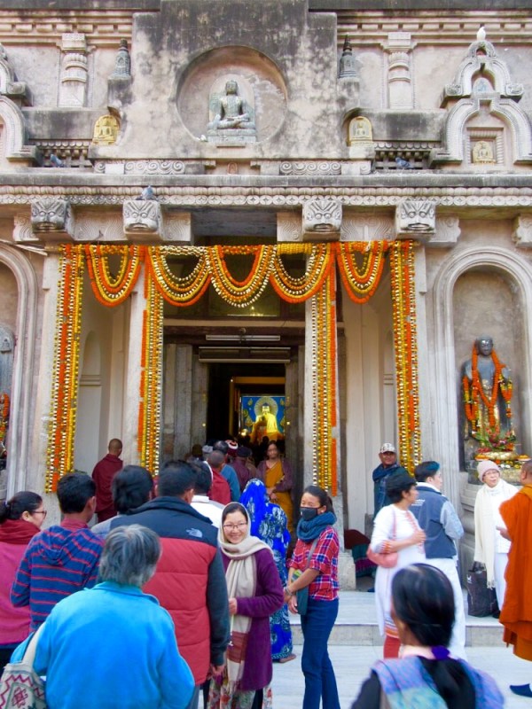 Il faut faire la file pour entrer au temple Mahabodhi et se recueillir devant le Bouddha aux cheveux bleus, Bodh Gaya, Inde.