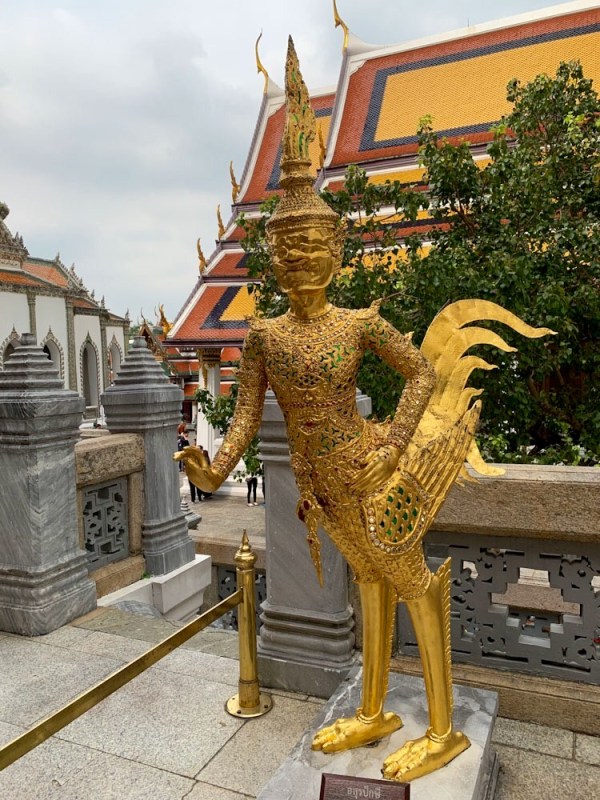 Une kinnari, une créature mythique mi-femme et mi-oiseau, se tient à l’entrée d’un temple. Site du Wat Phra Kaew, Bangkok, Thaïlande.