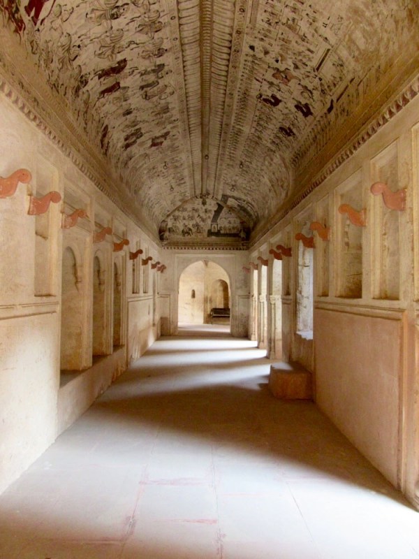 Les pièces intérieures du temple Laxmi Narayan sont construites en hauteur et nous surprennent par leur simplicité, Orchha, Inde.