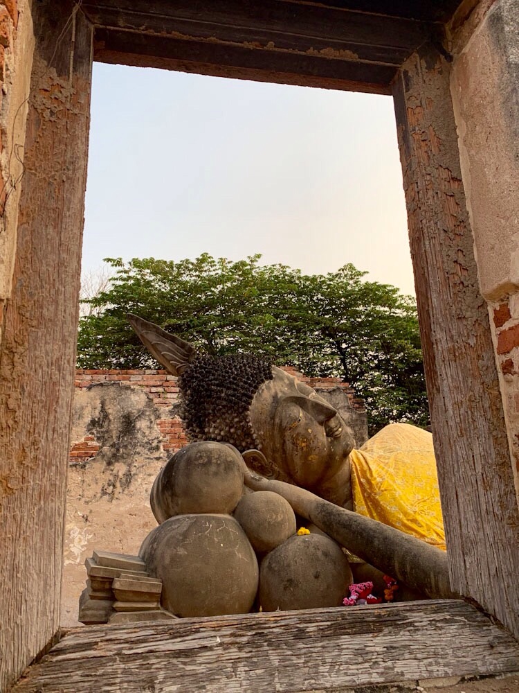 Ce Bouddha dans un temple dont le toit s’est effondré est très attachant malgré sa rusticité. Ayutthaya, Thaïlande.
