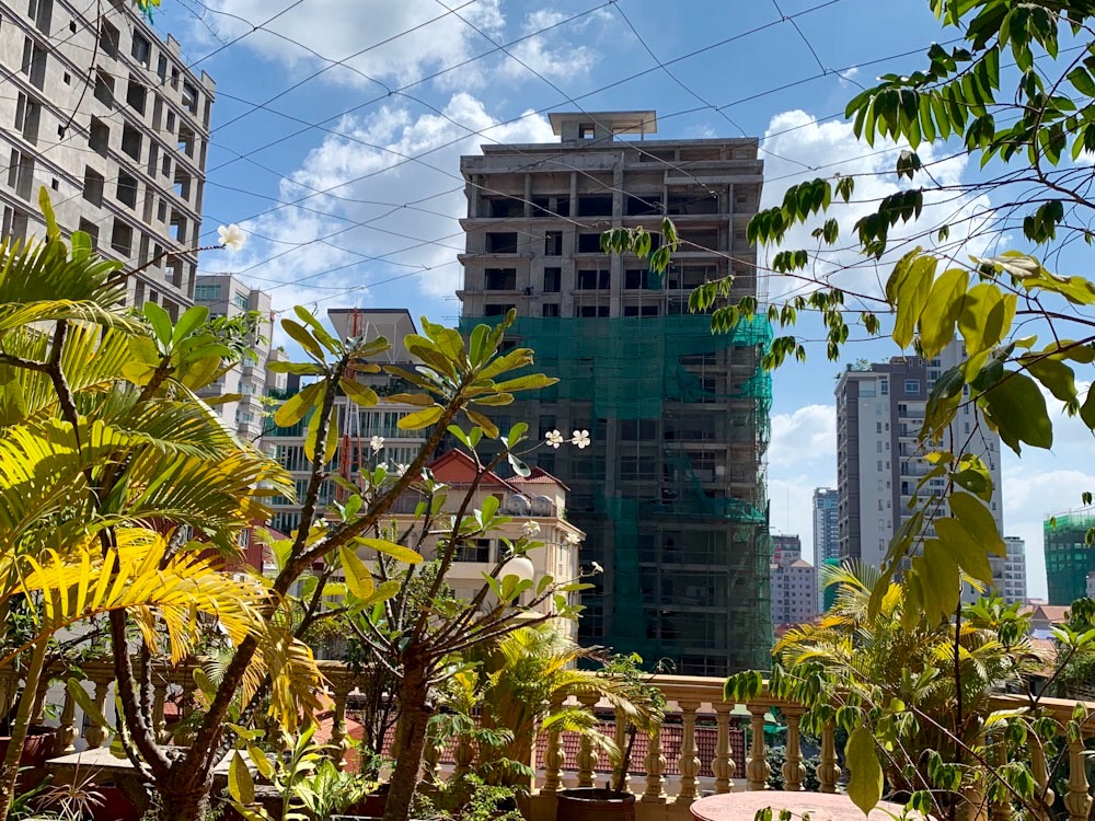 Alors que j’écris, confortablement installée à la terrasse de l’hôtel, devant notre chambre au 5e étage, un mouvement attire mon attention. Un homme travaille debout sur un échafaud presque en haut de l’immense en construction devant moi. Pouvez-vous le voir? Phnom Penh, Cambodge.