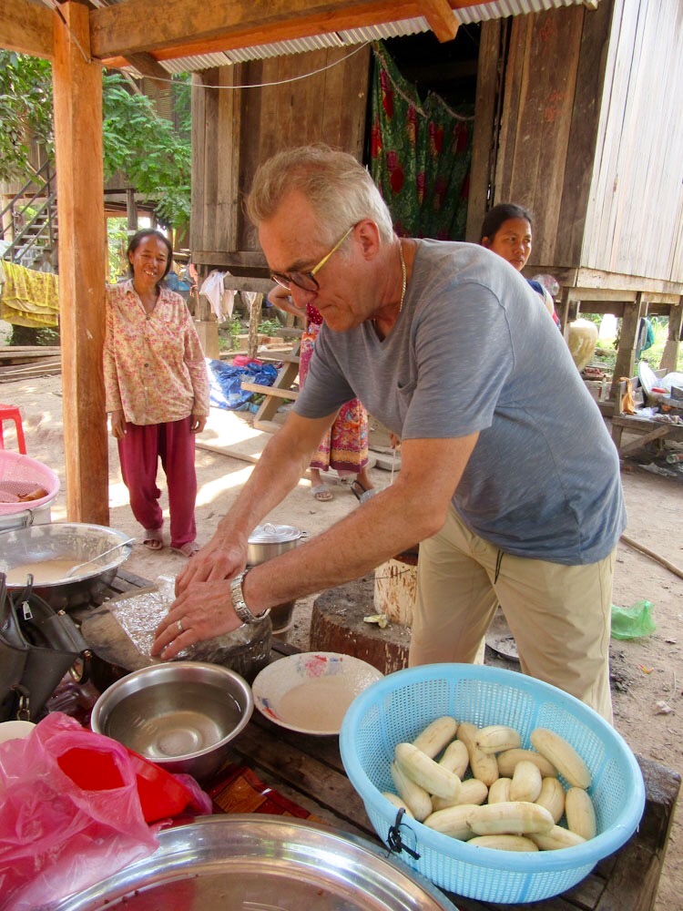 Robert prépare une banane qui sera trempée dans une pâte puis frite dans une grande marmite. Kratie, Cambodge.