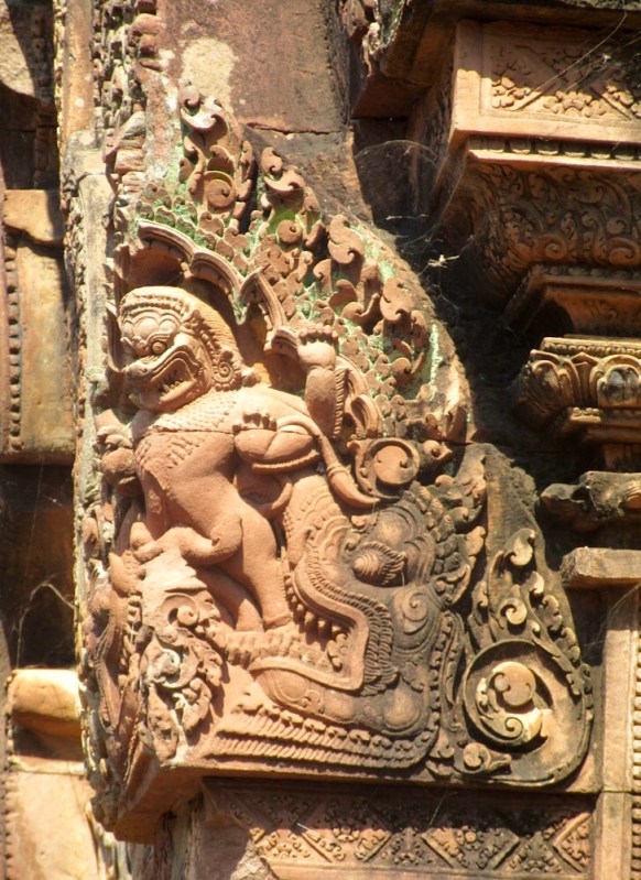 Détail de l’une des corniches d’un temple de Banteay Srei. Siem Reap, Cambodge.