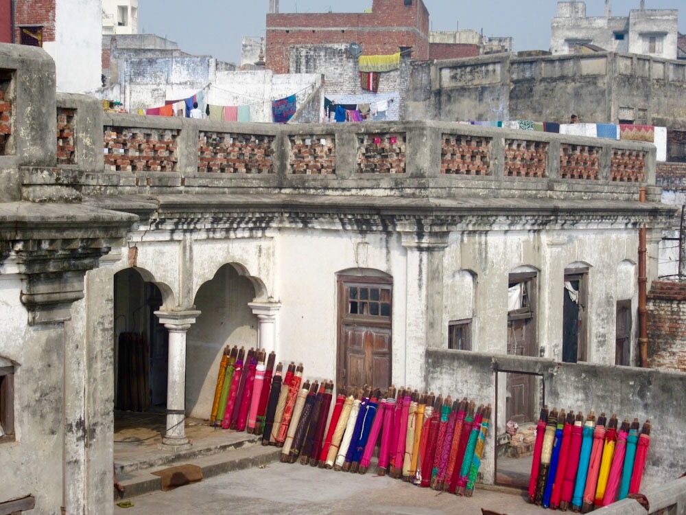 Un marchand a étalé ses rouleaux de tissus chatoyants sur le toit, Varanasi, Inde.