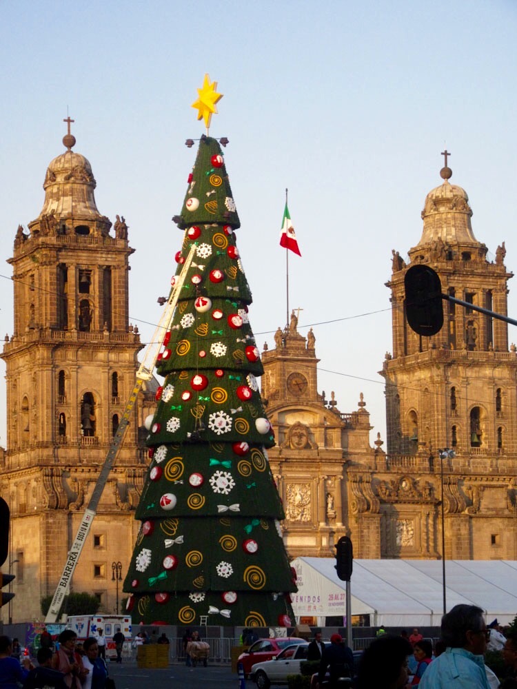 L’arbre de Noël devant la Cathédrale de Mexico est presque terminé, Centro Historico, Mexique.