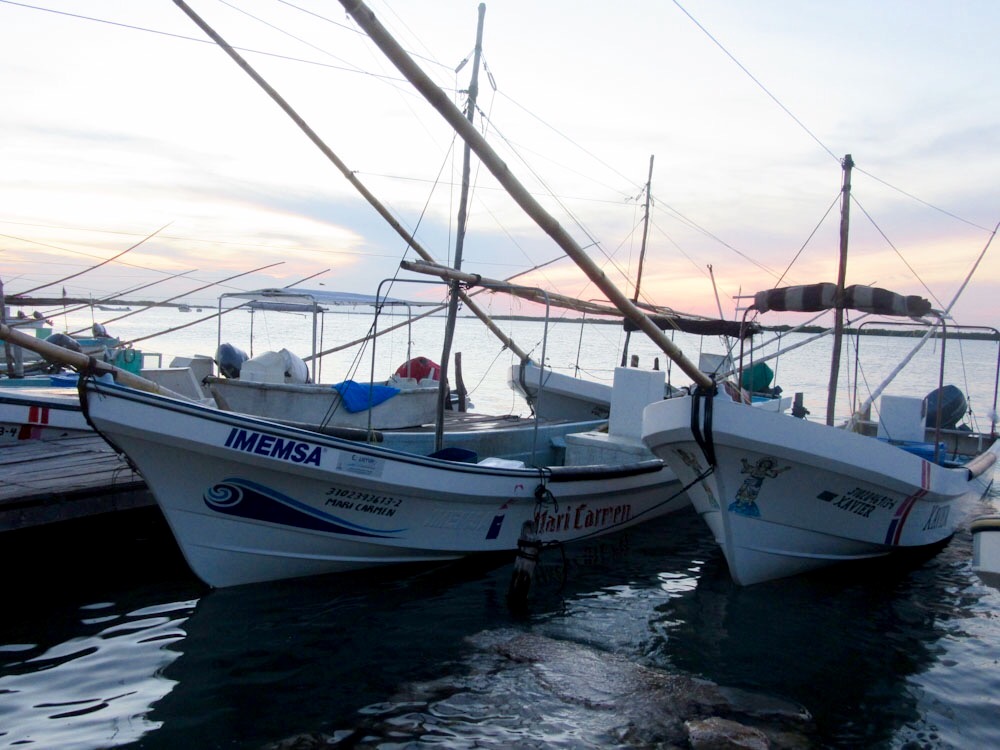 Les bateaux des pêcheurs sont bien amarrés au quai de Rio Lagartos. La marée monte et bientôt une partie de la route sera inondée. Yucatán, Mexique.