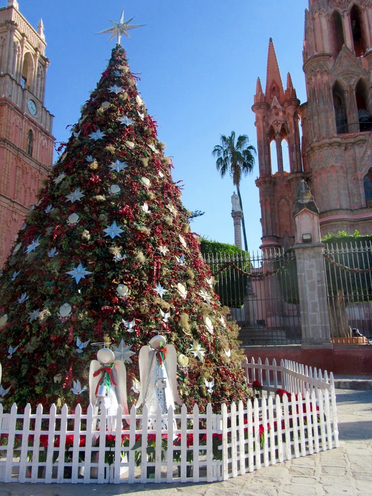 L’incontournable arbre de Noël devant la Parroquia, San amiguel de Allende, Guanajuato, Mexique.