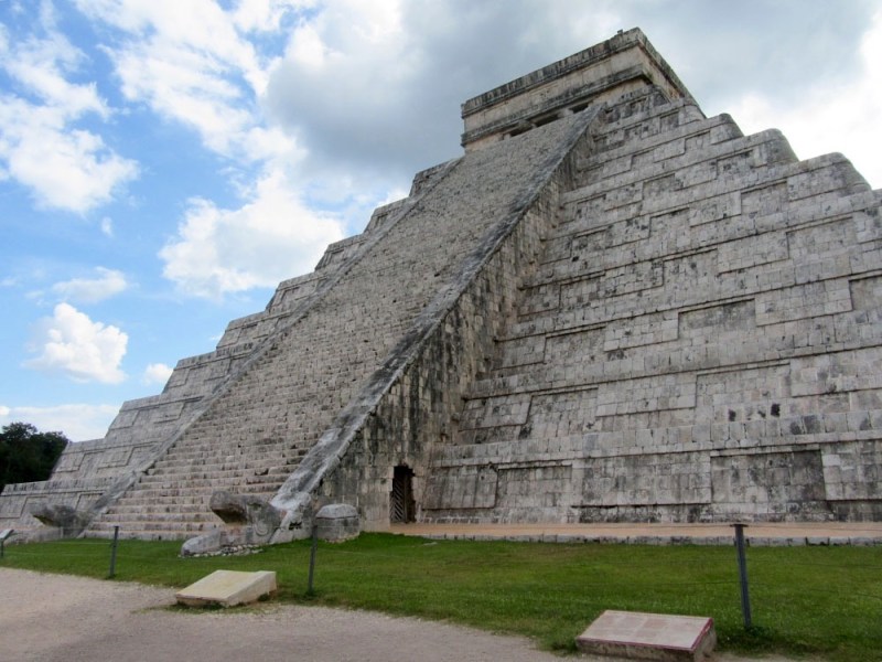 Des têtes de serpent sont encore présentes aux pieds de la pyramide de Kukulkan. Tout en haut, un petit temple où se déroulaient des cérémonies. Chichen Itzà, Mexique.