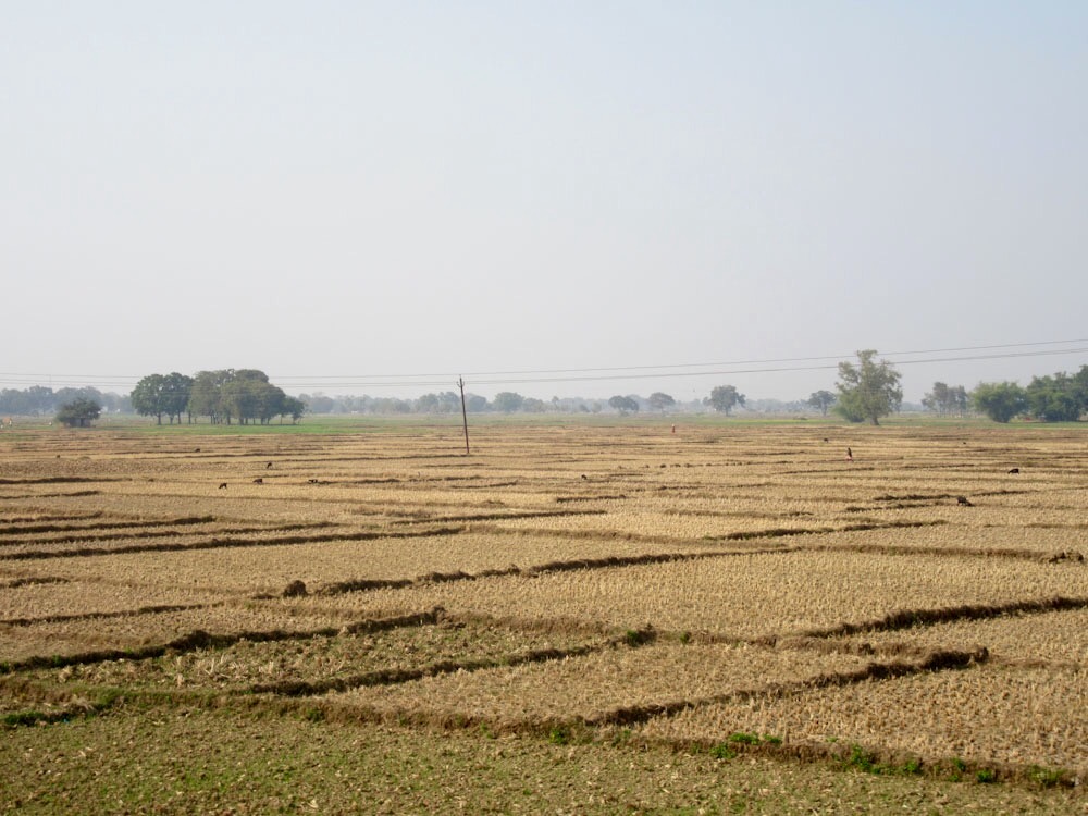 Le paysage rural défile le long de la voie ferrée entre Varanasi et Bodh Gaya. Inde.
