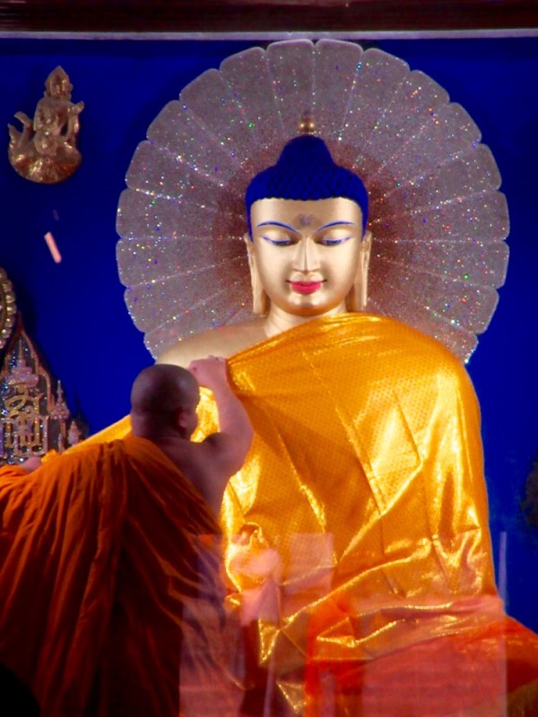 Un moine change la robe de Sakyamuni, le Bouddha aux cheveux bleus, Bodh Gaya, Inde.