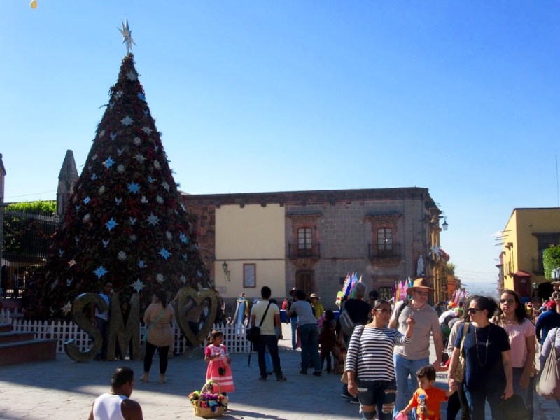 L’arbre de Noël devant la Parroquia sert d’arrière plan à d’innombrables séances photos. San Miguel de Allende, Guanajuato, Mexique.