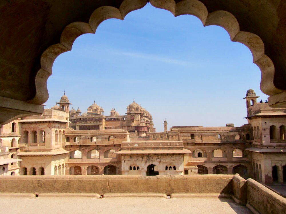 La cour intérieure du Raja Mahal avec une vue sur le Jahangir Mahal en arrière-plan, Orchha, Inde.