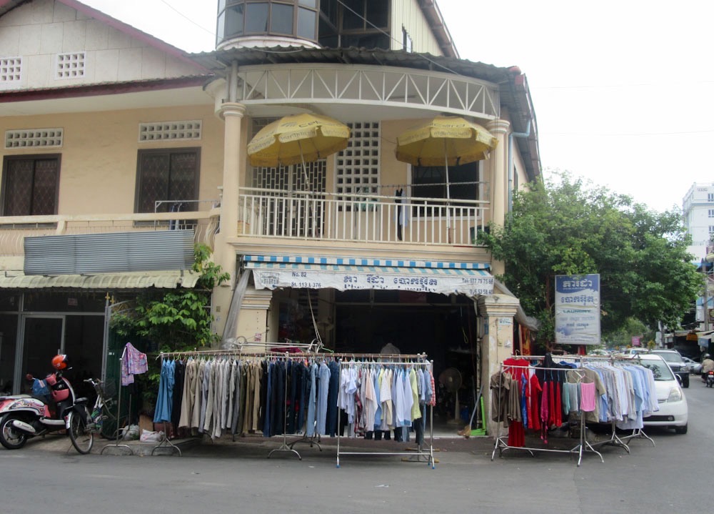 Des cordes à linge version Cambodgienne, elles me semblent bien pratiques. Ces supports de métal servent aussi bien à suspendre les vêtements pour le séchage que pour exposer ceux qui sont à vendre. Phnom Penh, Cambodge.