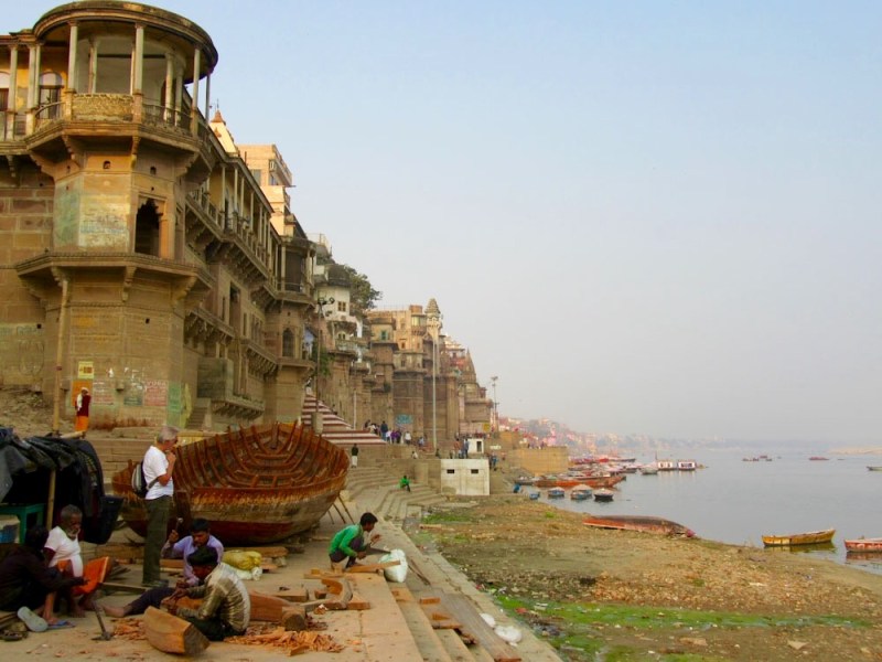 Á l’ombre des édifices anciens qui semblent veiller sur le Gange depuis toujours, des artisans construisent un bateau, Varanasi, Inde.