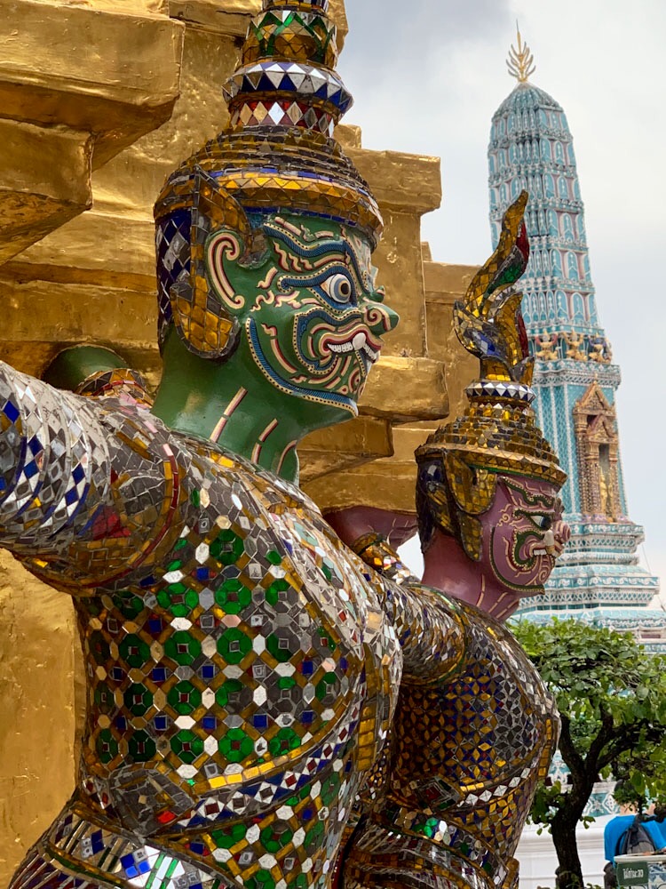 Une rangée de ces créatures mythiques maintient un des étages d’un stupa doré. Plus loin, un stupa recouvert de céramique. Site du Wat Phra Kaew et du Grand Palais. Bangkok, Thaïlande.