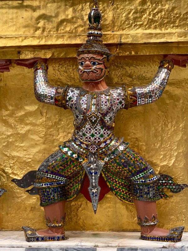 Une rangée de ces personnages semble maintenir les étages supérieurs d’un stupa doré. Wat Phra Kaew, Bangkok, Thaïlande.