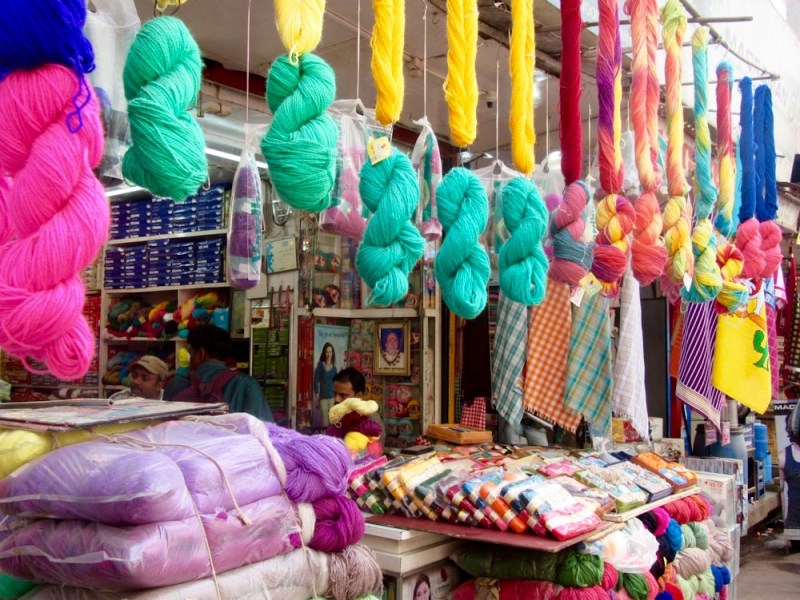 Échoppe de fils et de laine dans le vieux quartier Chowk, Varanasi, Inde.