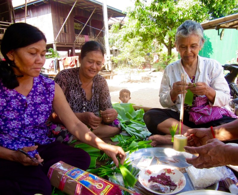 Ces femmes préparent des décorations pour une cérémonie religieuse suite à la construction de la maison voisine. Les bonzes viendront pour la célébration. Kratie, Cambodge.