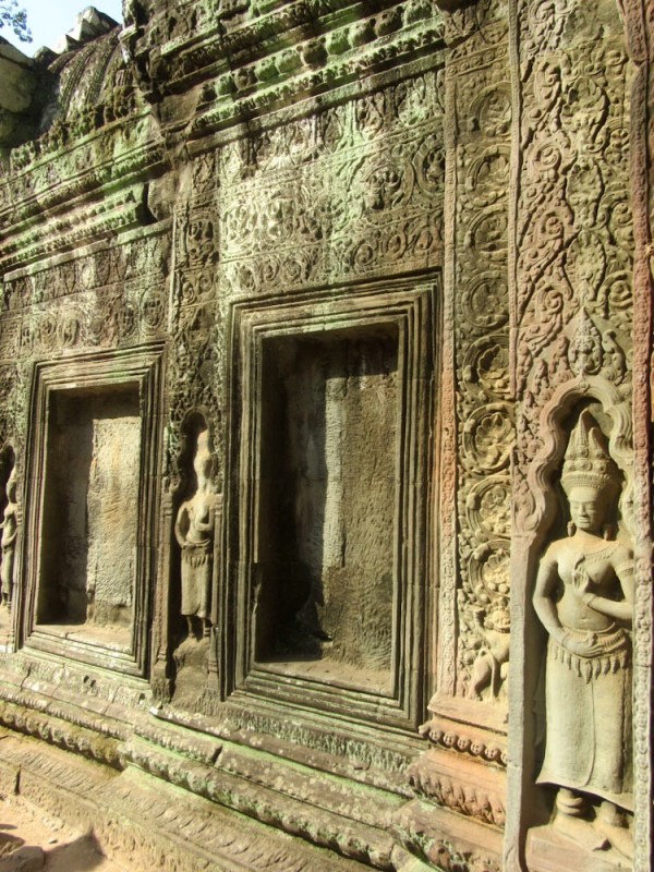 Les racines des arbres ont repris possession de Ta Prohm et attirent l’attention des photographes, mais il ne faut pas oublier les fines ciselures sur les murs et les apsaras bien conservées. Siem Reap, Cambodge.
