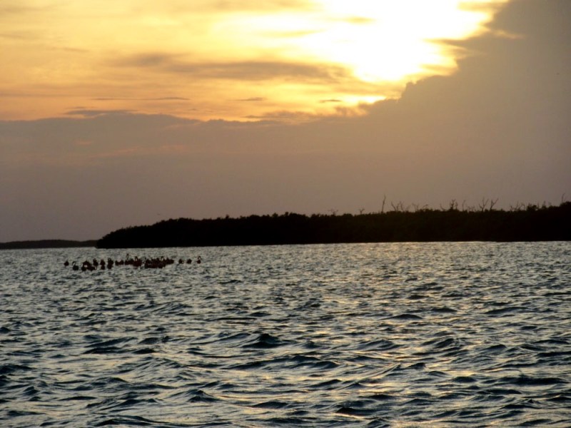 Nous apercevons de loin des flamants roses qui s’avancent vers nous sous le soleil couchant de Rio Lagartos, Yucatán, Mexique.