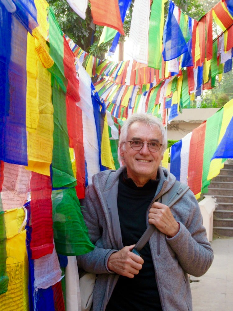 Robert sous les drapeaux de prière, Mahabodhi, Bodh Gaya, Inde.