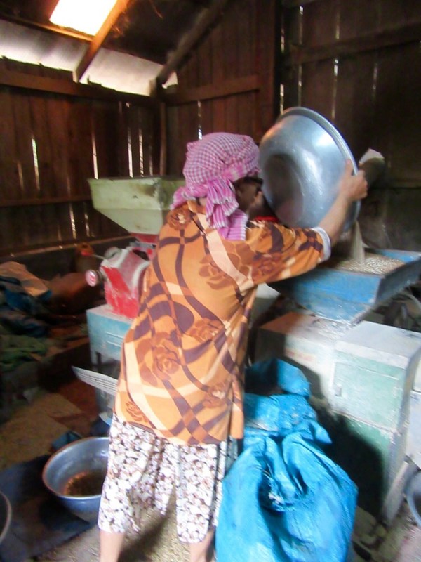 Dans sa petite fabrique sous sa maison, cette femme traite les grains de riz pour enlever leur enveloppe brune. Les grains proviennent des habitants des environs qui ont fait sécher leur production au soleil, sur une grande bâche, devant leur maison. Chhlong, Cambodge.