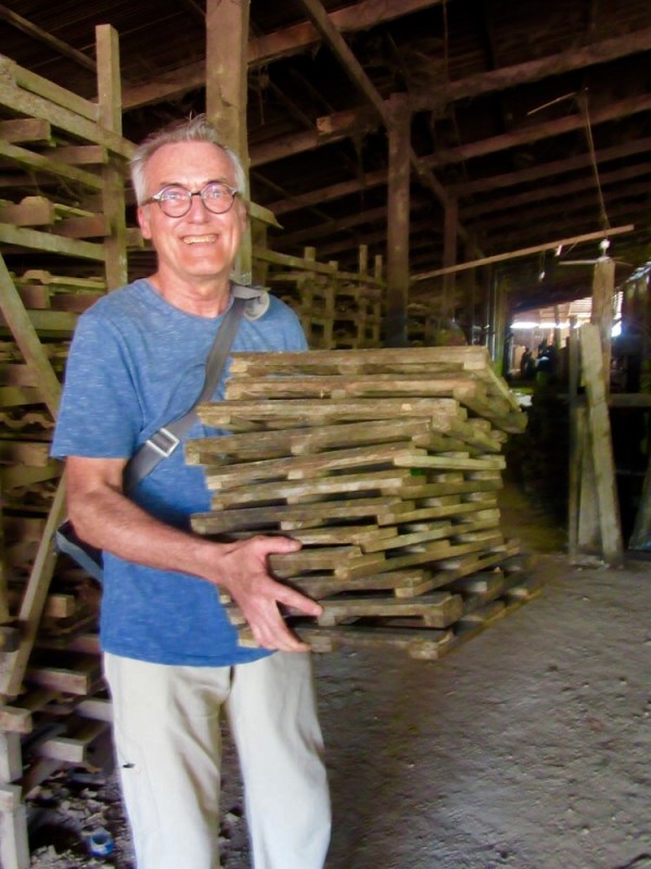 Les tuiles humides sont déposées sur un petit support de bois et placées sur des tablettes pour le séchage. Kratie, Cambodge.