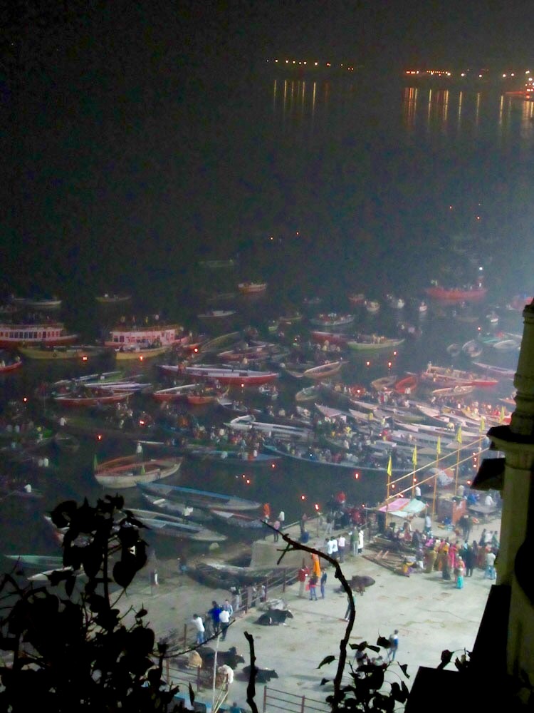 Des pèlerins venus en barque participent à la puja au ghat Dasashwamedh, Varanasi, Inde.