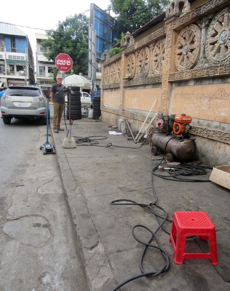 Si les pneus de votre moto manquent d’air ou que ceux de votre voiture doivent être changés, il est possible d’obtenir les services d’un garagiste sur le trottoir… Phnom Penh, Cambodge.