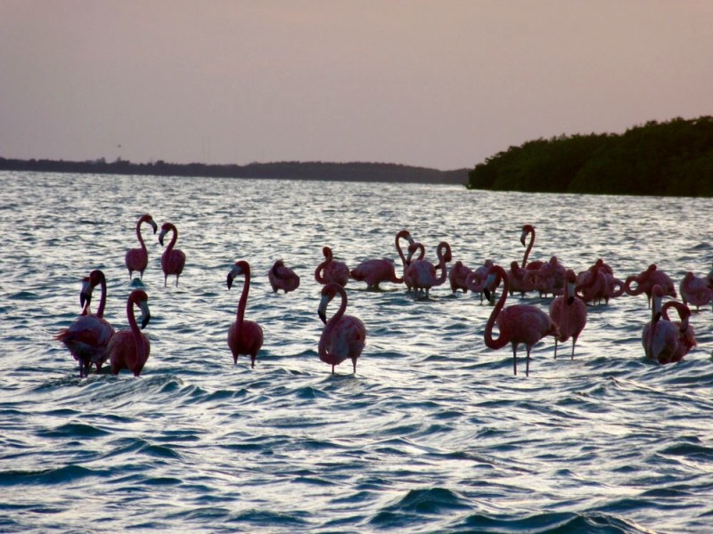Les oiseaux ne semblent pas perturbés par notre présence alors que leur gracieuse silhouette de détache sur les flots éclairés par lles reflets du soleil couchant. Rio Lagartos, Yucatán, Mexique.