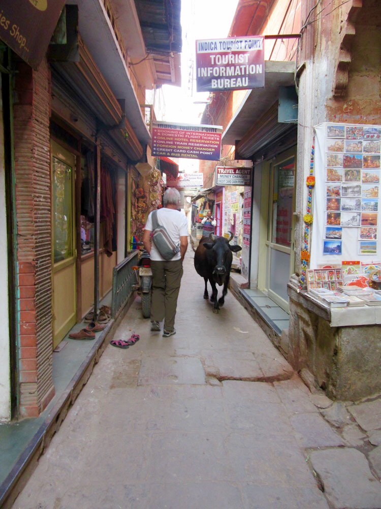 Une rencontre très habituelle dans les ruelles de Chowk, mieux vaut se ranger…ces bêtes ont des cornes, Varanasi, Inde.