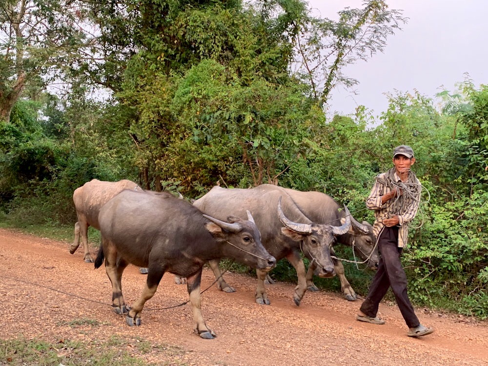 En revenant de Chhlong nous rencontrons un fermier qui déplace ses buffles, nous leur laissons la place. Cambodge.