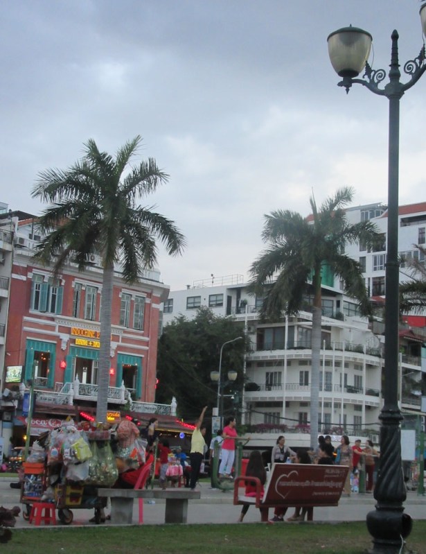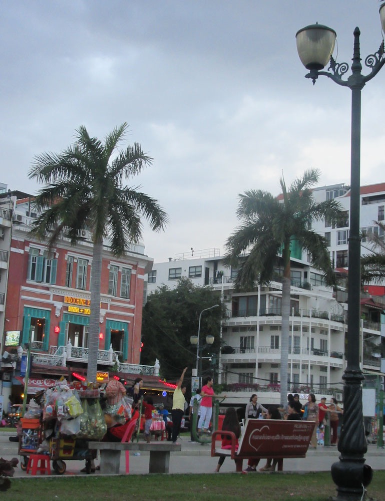 À la tombée de la nuit, alors que l’air se rafraîchit un peu, la promenade sur le bord de l’eau s’anime de plus en plus. Phnom Penh, Cambodge.