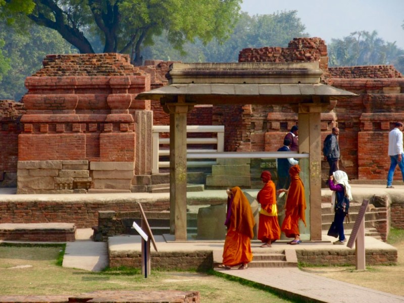Des moines bouddhistes visitent les ruines de Sarnath, la région où Bouddha aurait prononcé son premier discours après son illumination à Bodh Gaya, Inde