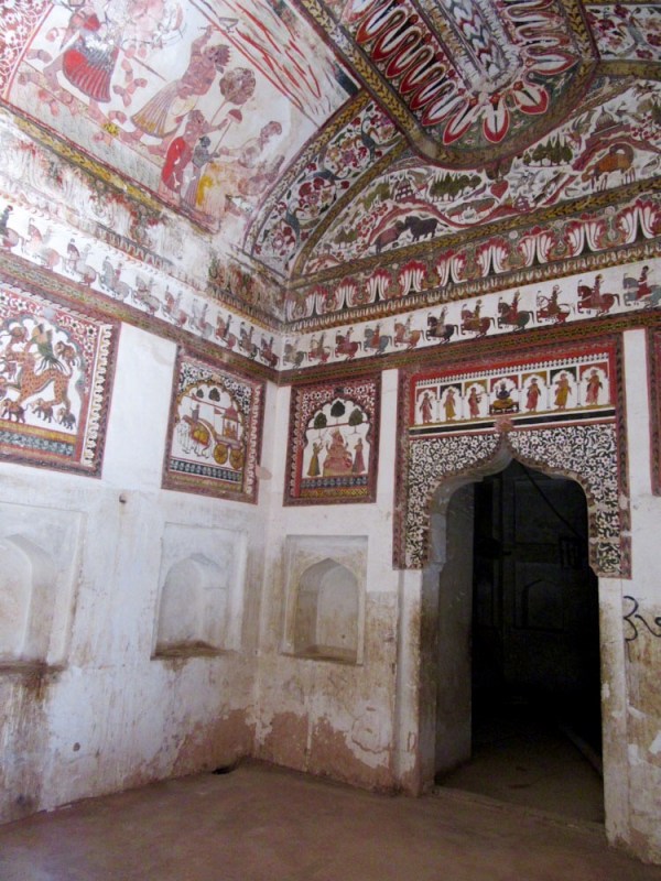 Les murs des pièces intérieures du Raja Mahal étaient recouverts de peintures, ce sont de véritables œuvres d’art. Orchha, Inde.