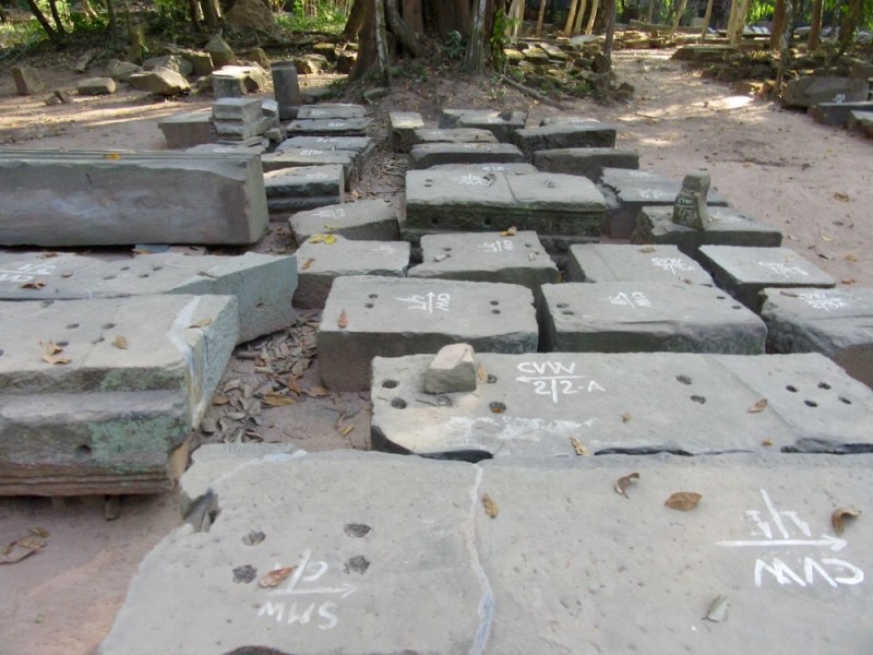 Ces pierres numérotées constituent des pièces d’un gigantesque casse-tête des temples d’Angkor, Siem Reap, Cambodge.